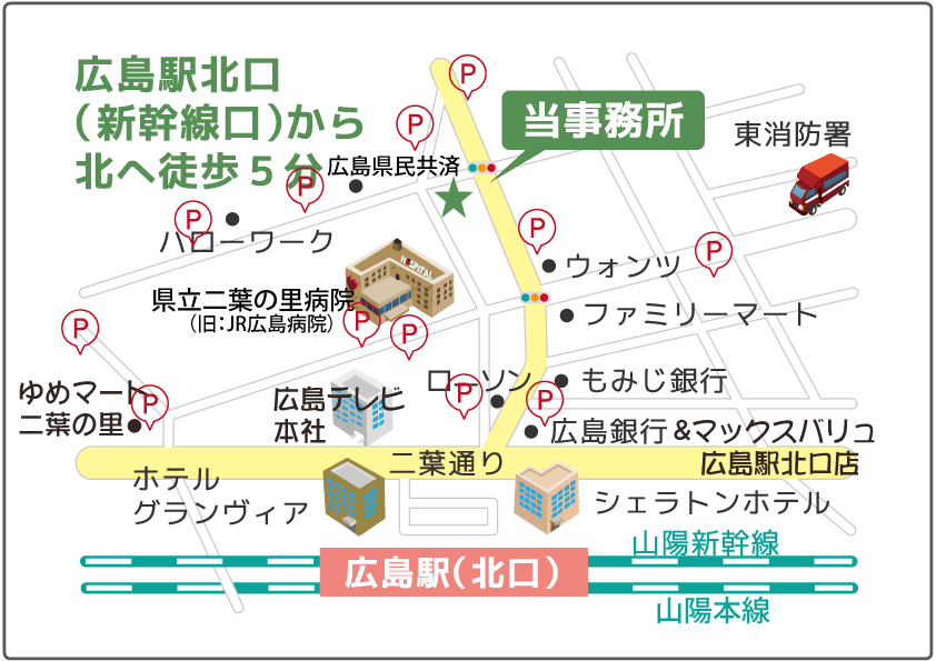公共交通機関をご利用の場合JR広島駅新幹線口から出て、二葉町方面へ徒歩約3分のところにございます。