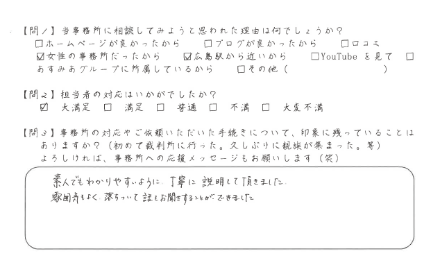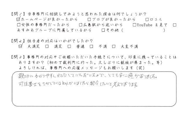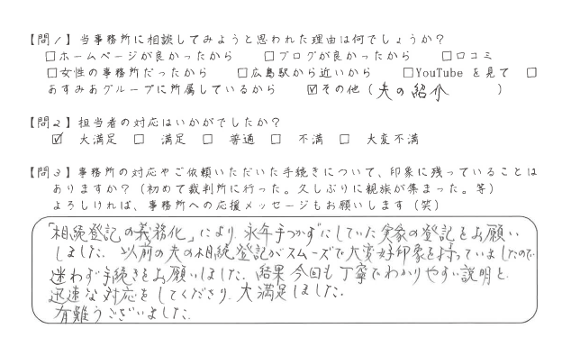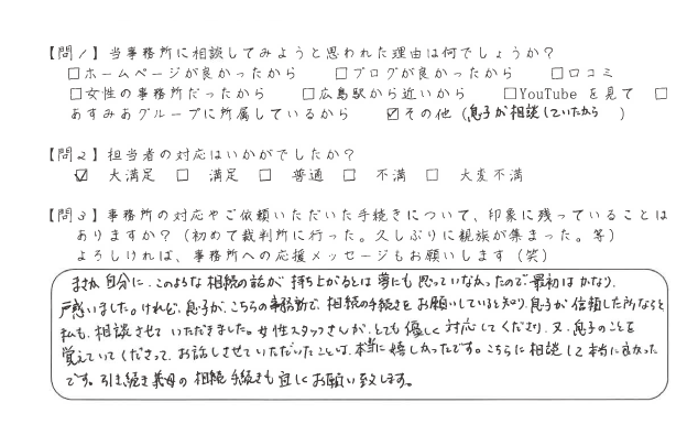 当事務所で相続に関する悩みや問題を解決された依頼者様の声(アンケート)をご紹介します。たくさんの声をいただいております。