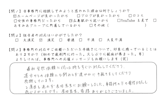 最初、突然依頼に伺ったときもすぐに対応してくださり、遠方からの依頼にも関わらず、速やかに手続きをしてくださり感謝しています。