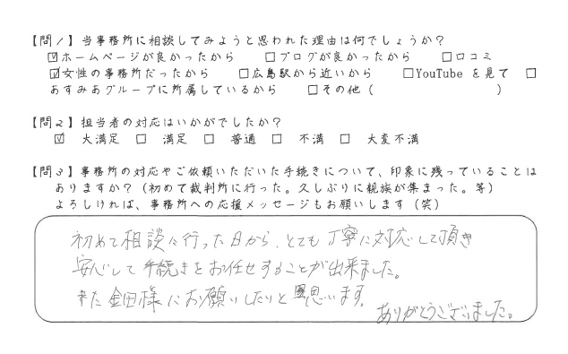 初めて相談に行った日から、とても丁寧に対応して頂き、安心して手続きをお任せすることが出来ました。また金田様にお願いしたいと思います。ありがとうございました。
